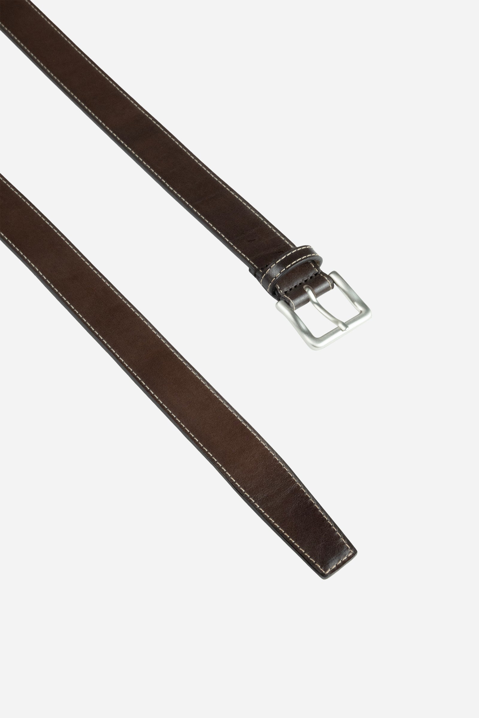 Cintura in vera pelle liscia, cuciture a contrasto, fibbia quadrata in argento e puntale lungo.