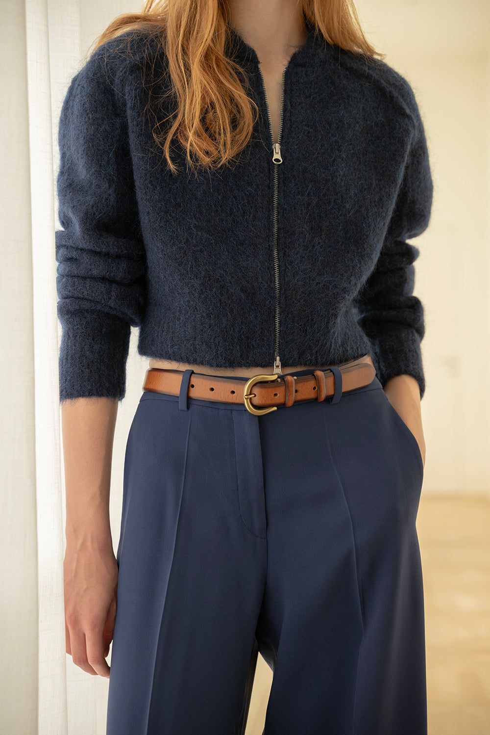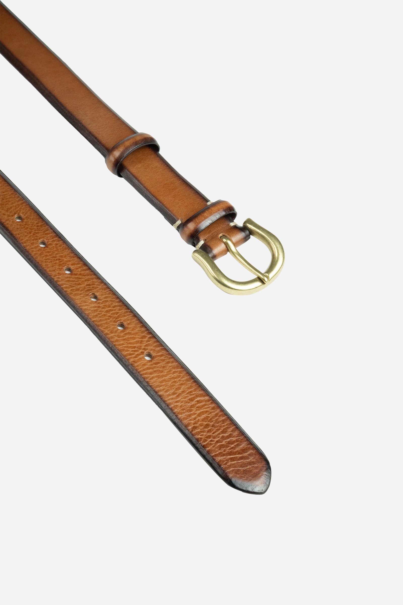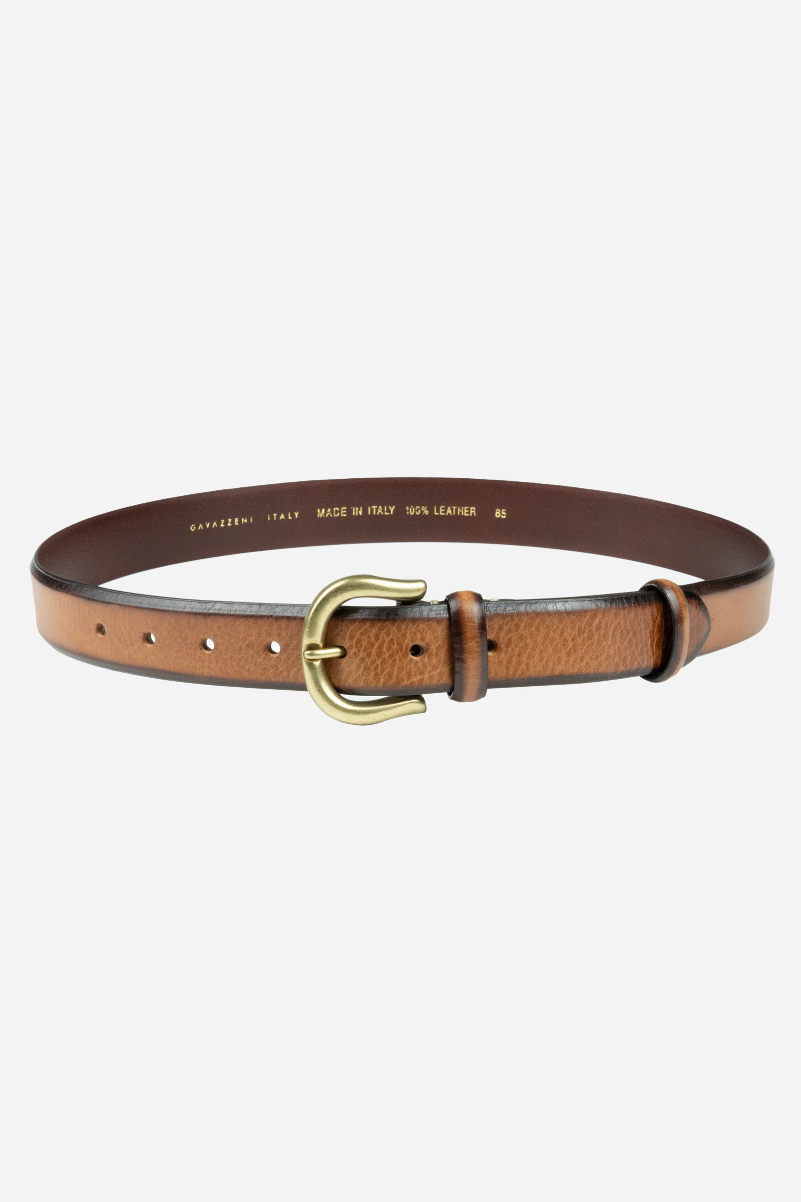 Cintura realizzata in vera pelle liscia texture leggermente granulata. Fibbia in metallo color ottone con una forma arrotondata e un design classico.