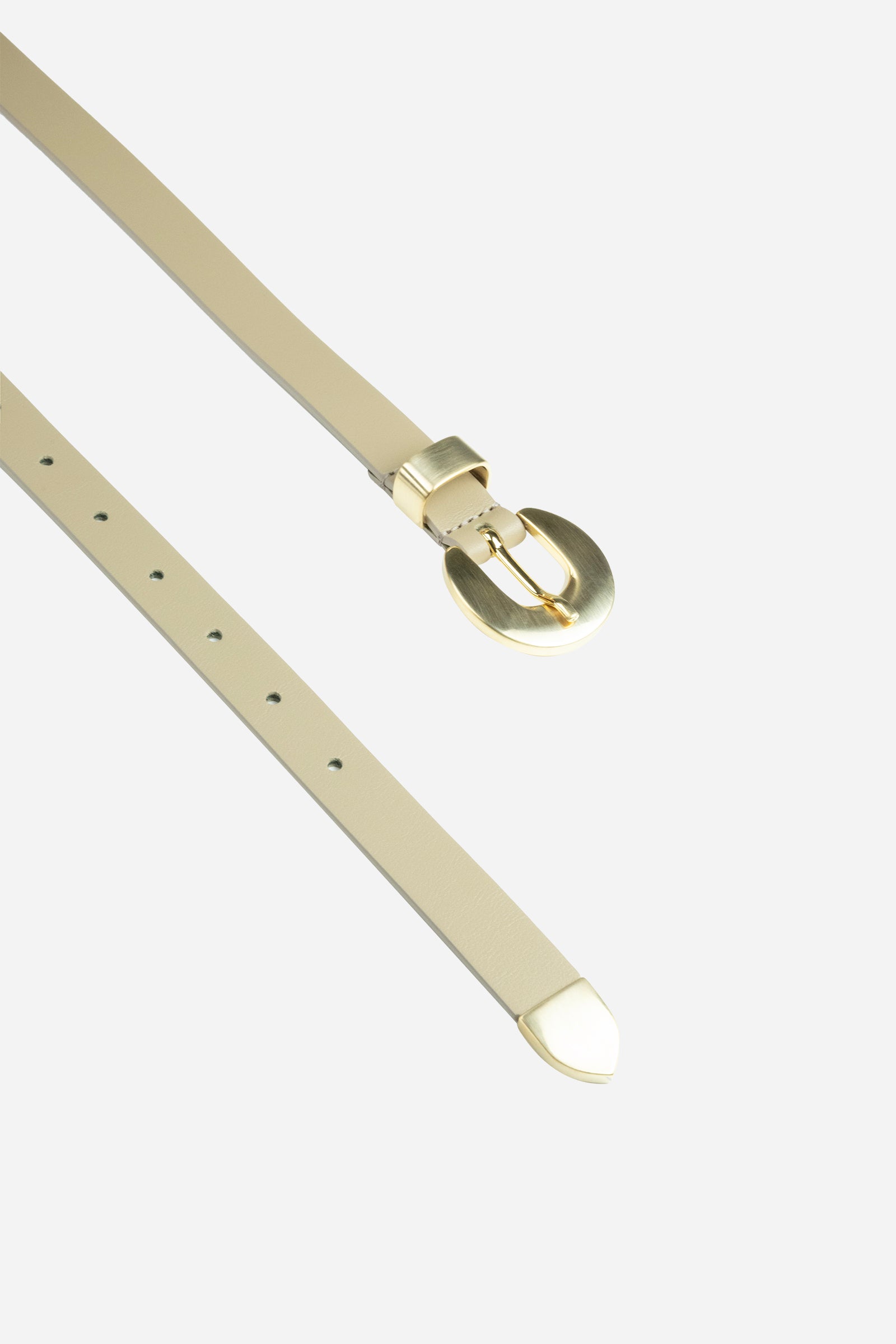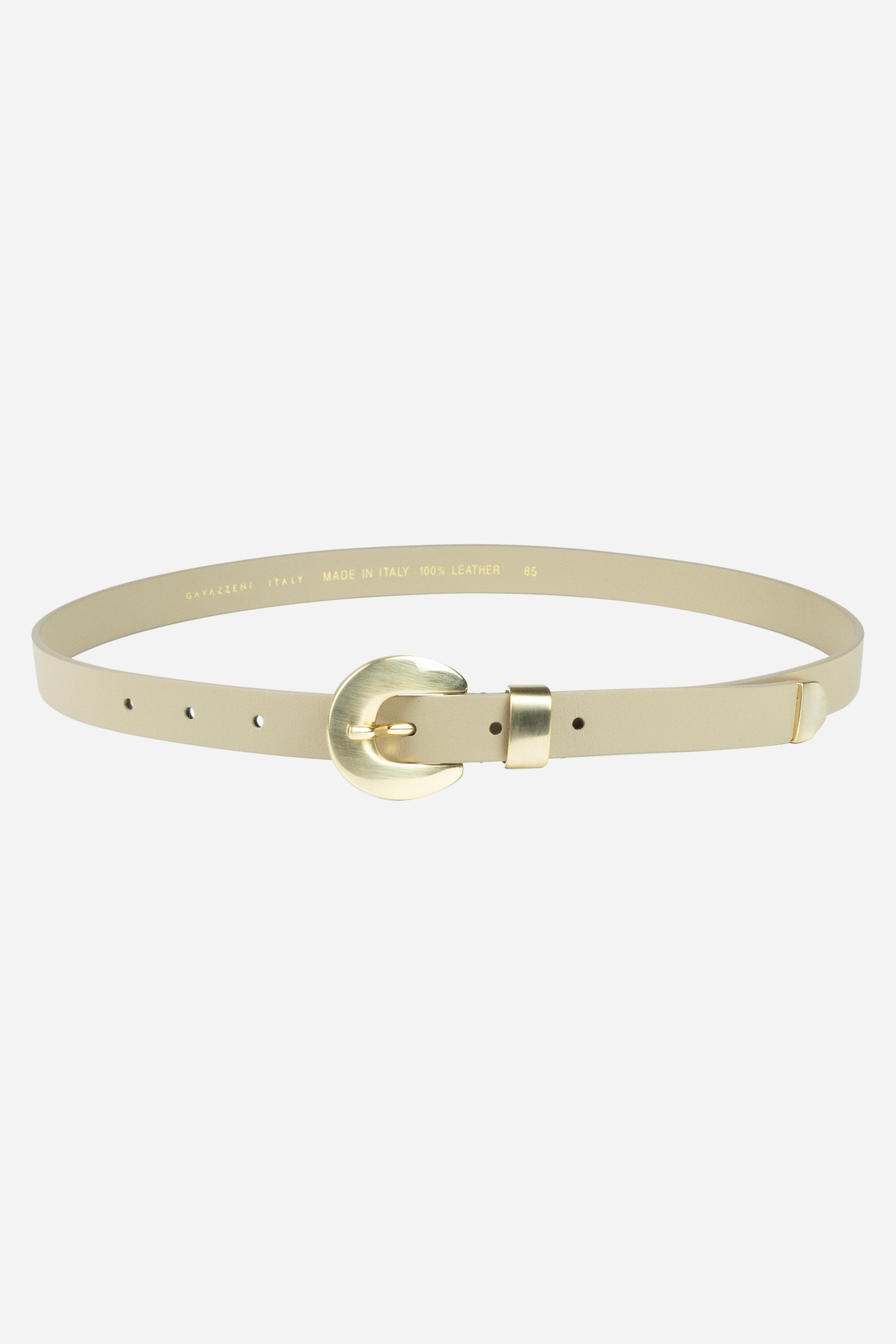 Cintura realizzata in vera pelle liscia, trittico fibbia passante e puntale in oro satinato.
