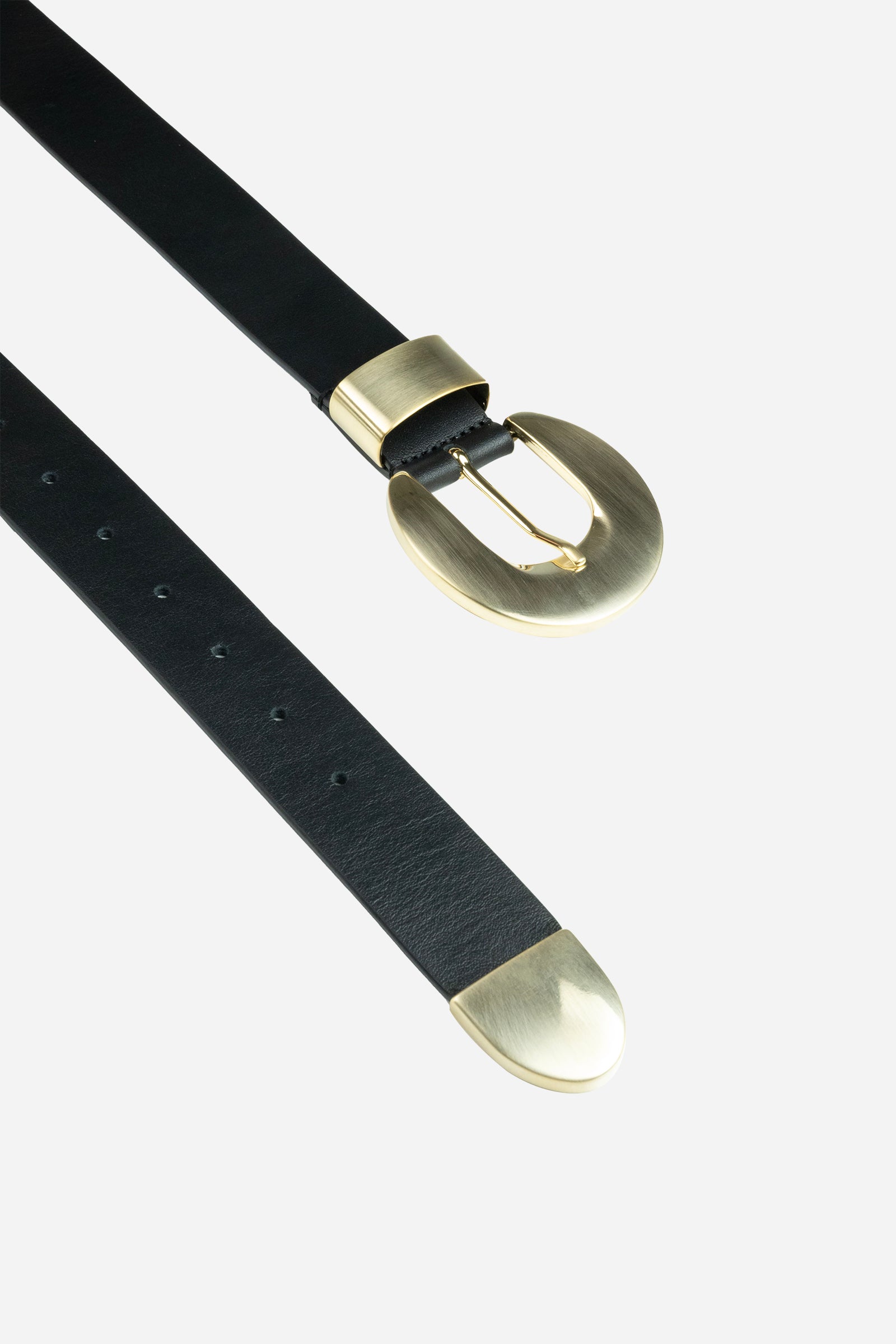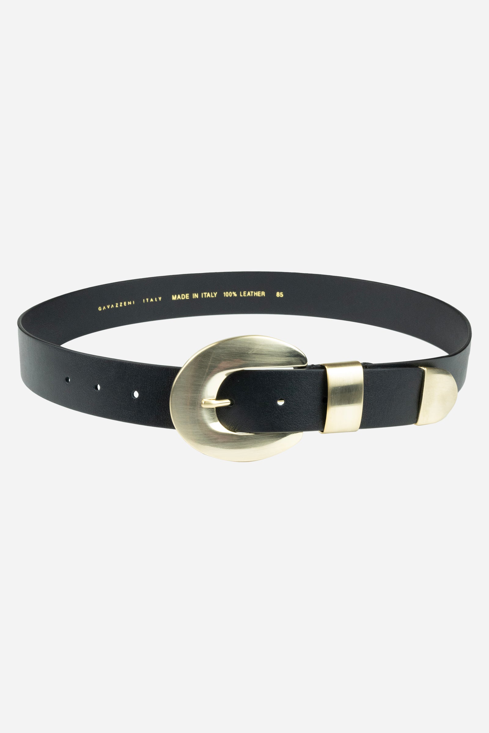 Cintura realizzata in vera pelle liscia, trittico fibbia passante e puntale in oro satinato.