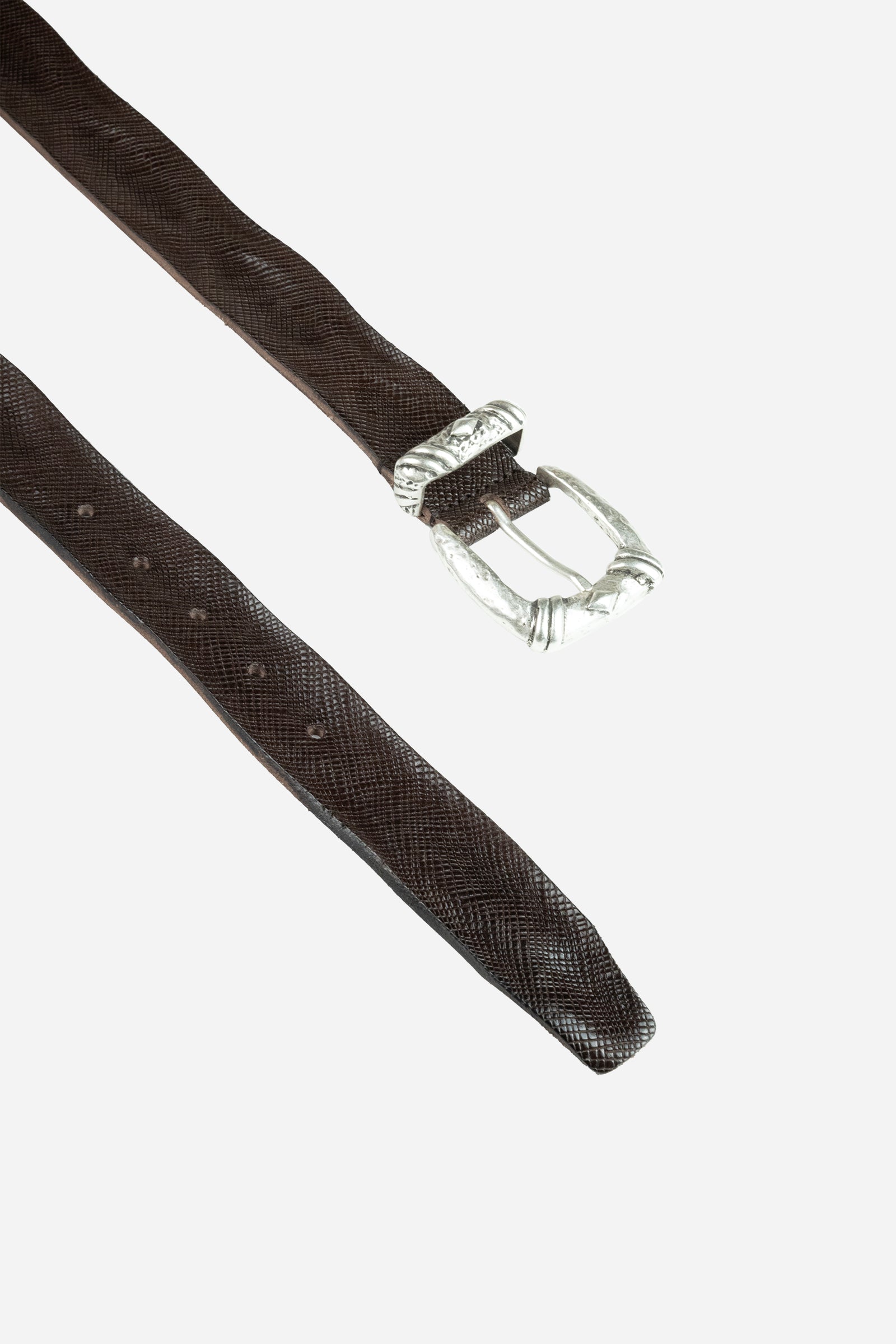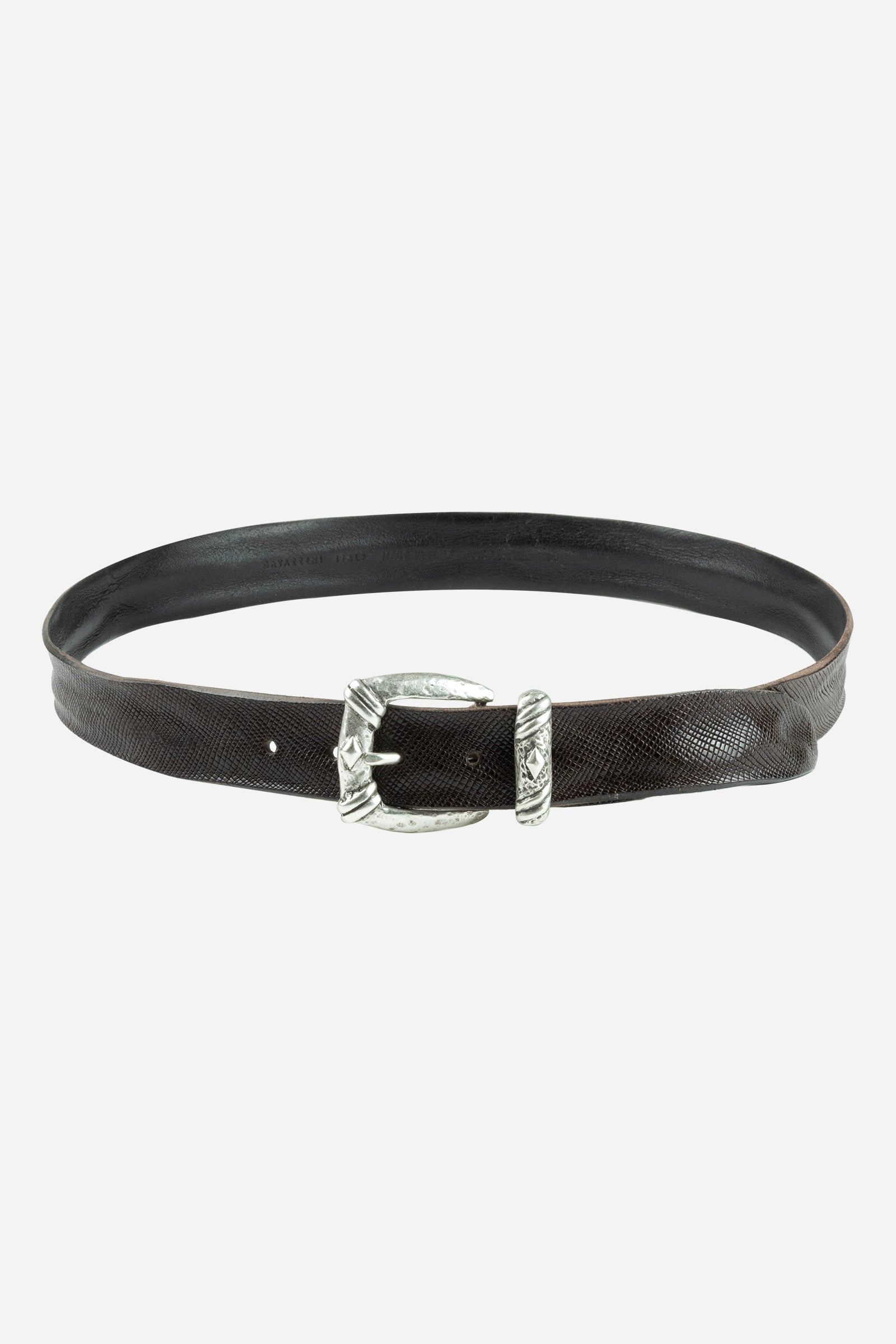 Cintura in vera pelle laserata e lavorata per un effetto vintage, fibbia e passante in argento invecchiato e lavorato.
