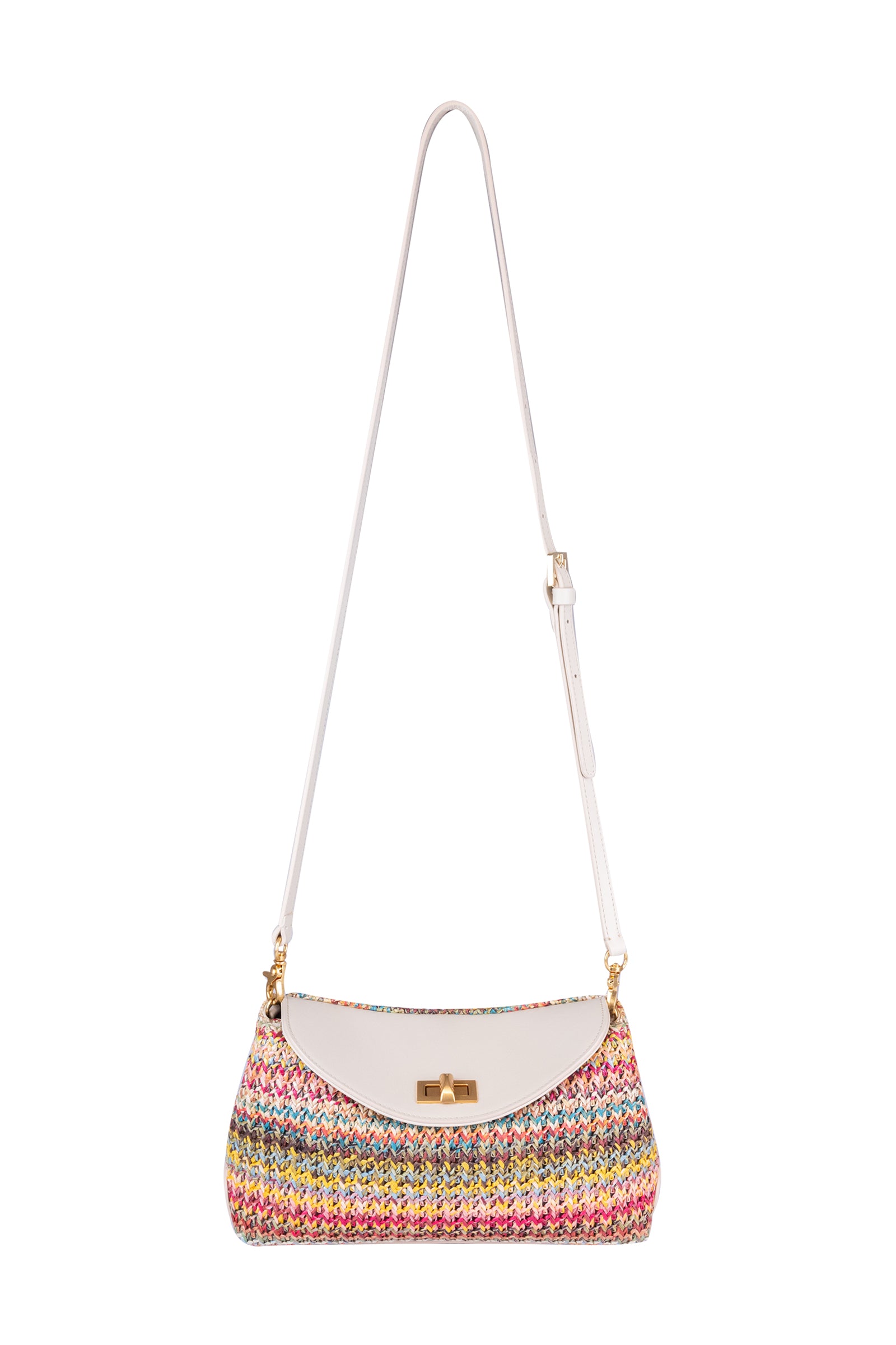 Borsa in rafia dal fascino naturale, caratterizzata da una silhouette morbida e da una patta arrotondata che valorizza il design. Leggera e versatile, aggiunge un tocco contemporaneo ai look quotidiani. Dotata di tracolla per essere portata comodamente a spalla o crossbody, è impreziosita da una chiusura a girello logata in metallo, dettaglio iconico che completa il modello.