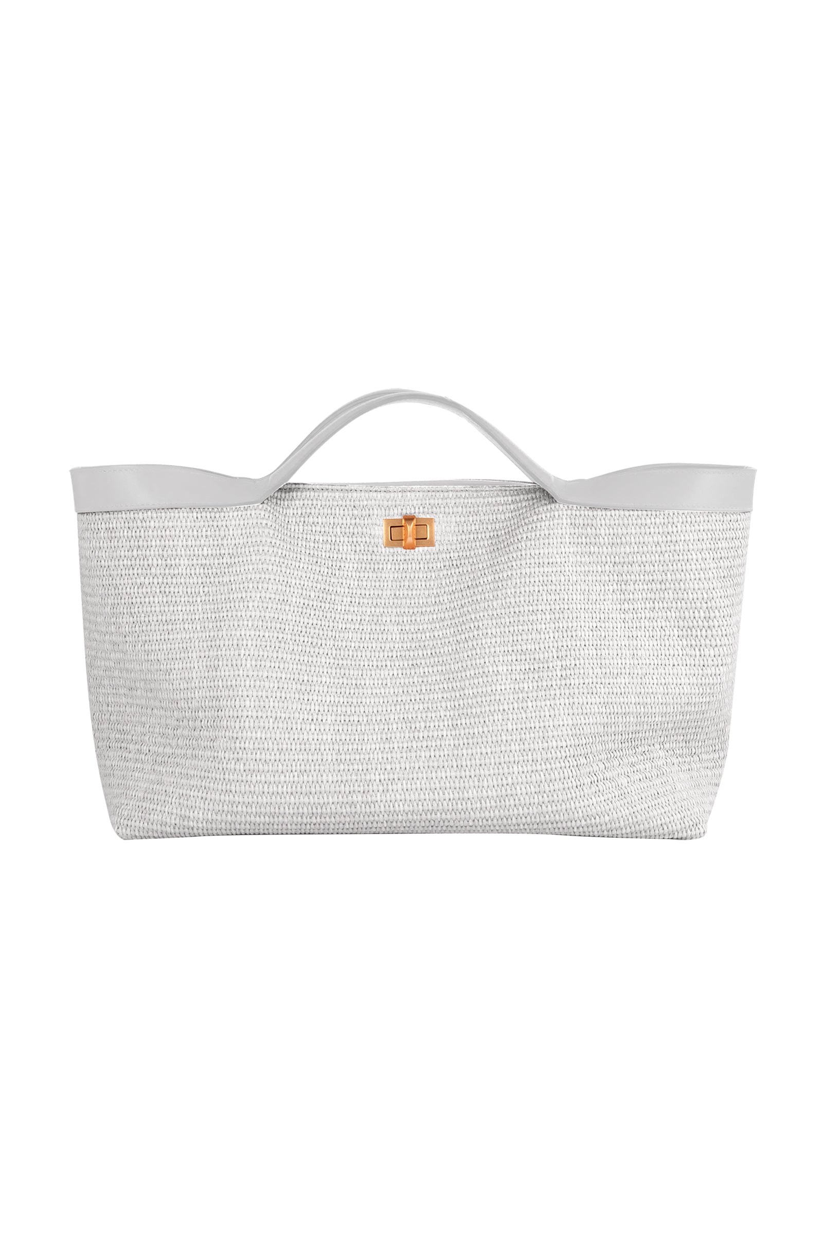 Borsa in rafia con riporti in pelle, caratterizzata da una forma contemporanea e cool. Capiente e versatile, è pensata per accompagnare con stile la quotidianità. Dotata di tracolla per essere indossata comodamente a spalla o crossbody, presenta una chiusura a girello logata che aggiunge un dettaglio distintivo al design.