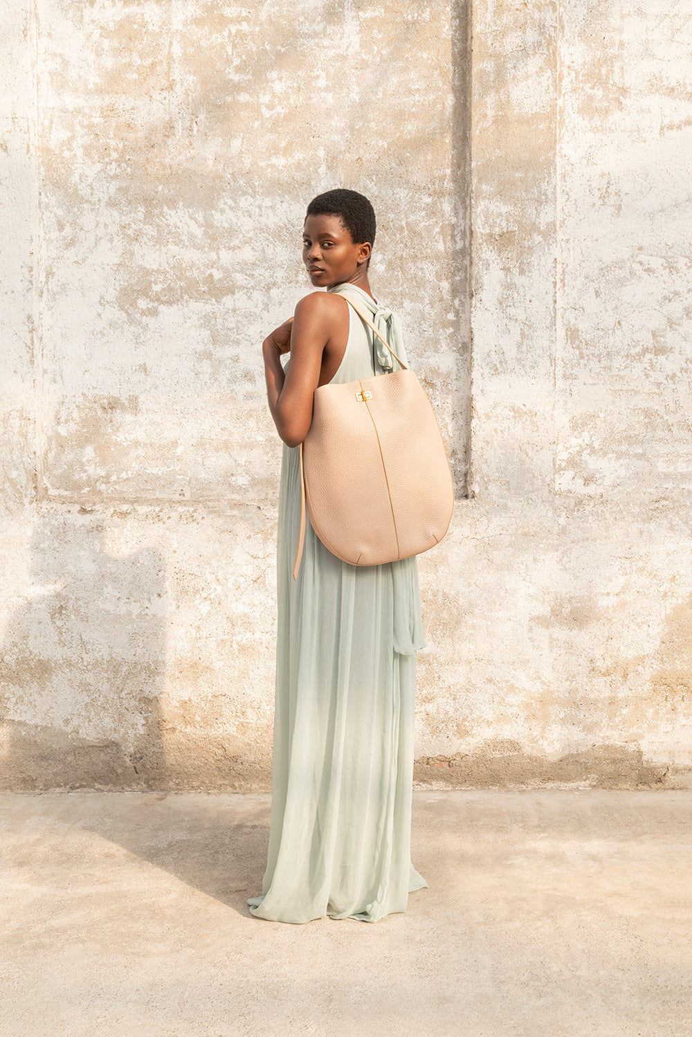 Eleganza senza tempo e funzionalità si incontrano in questa borsa shopper in pelle martellata color cuoio. Dalla linea morbida e silhouette moderna, è perfetta da portare a spalla grazie al manico ampio e confortevole.